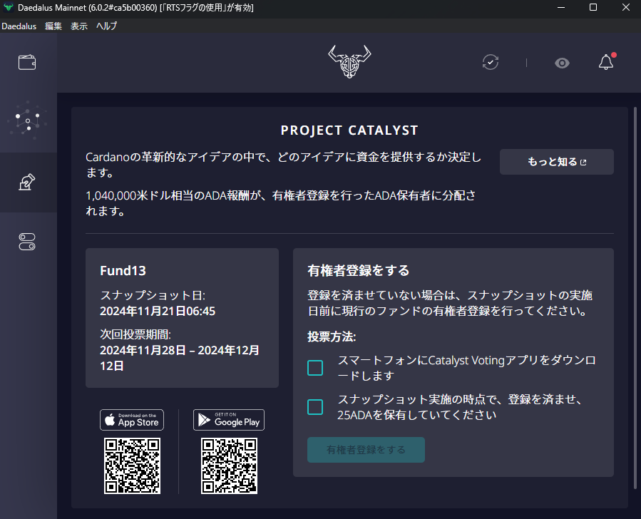 いままでカタリストを使った投票には最低500ADAが必要でしたが、今回(Fund13)から250ADAから参加出来るようになりました。11月21日にチェーンのスナップショットがとられます。それまでに有権者登録を行ってください。その後さまざまな案件や提案などがカタリスト(アプリ)上に出てきますので、このアイデアが良い!というものに投票してください。
