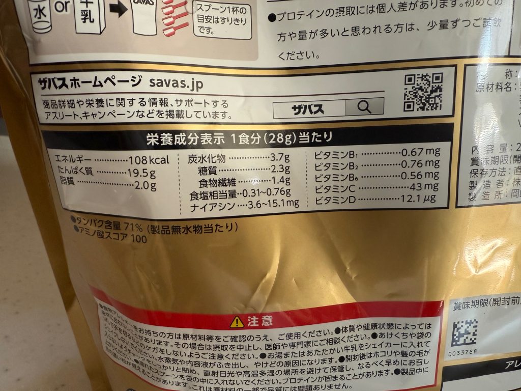 ⑤:食事内容:プロテインのみにしました。 スプーン28gのプロテインをを8杯(タンパク質39g)入れて600mlの水に溶かして飲みました。 ※プロテインの栄養素は写真の通り。
