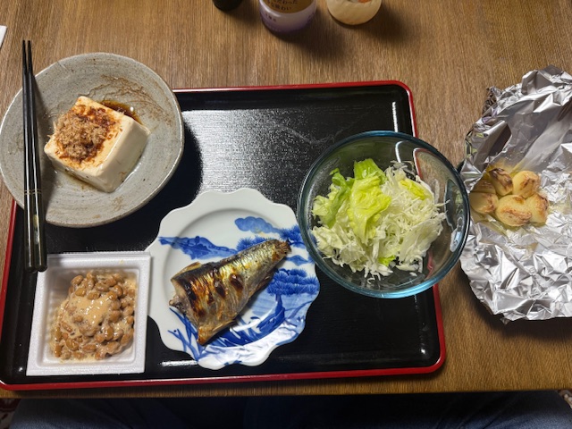 夕食:焼き魚(サンマ?)、納豆、冷奴、サラダ、焼き芋