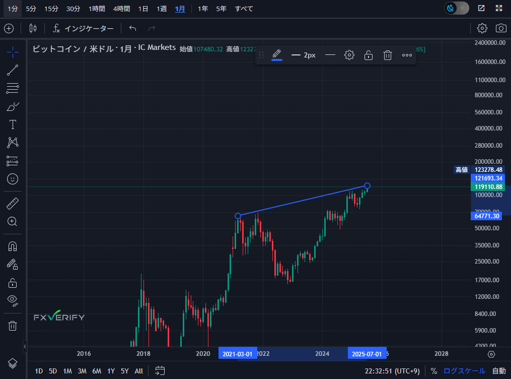 2021年3月から2025年7月の紫色のトレンドラインは多くの投資家が注目しています。